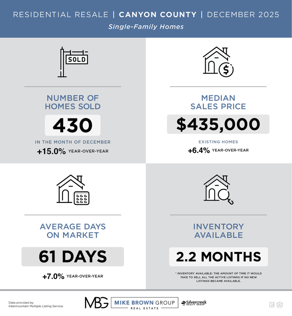 Stay informed about the latest trends in the Treasure Valley’s resale housing market. This page provides an overview of residential real estate activity in Ada and Canyon Counties for December 2025. Key metrics include the number of homes sold, median sales price, average days on market, and the current inventory of available properties. Whether you’re a buyer, seller, or simply interested in the local market, these reports offer valuable insights into the dynamics of the Boise metro area housing landscape.