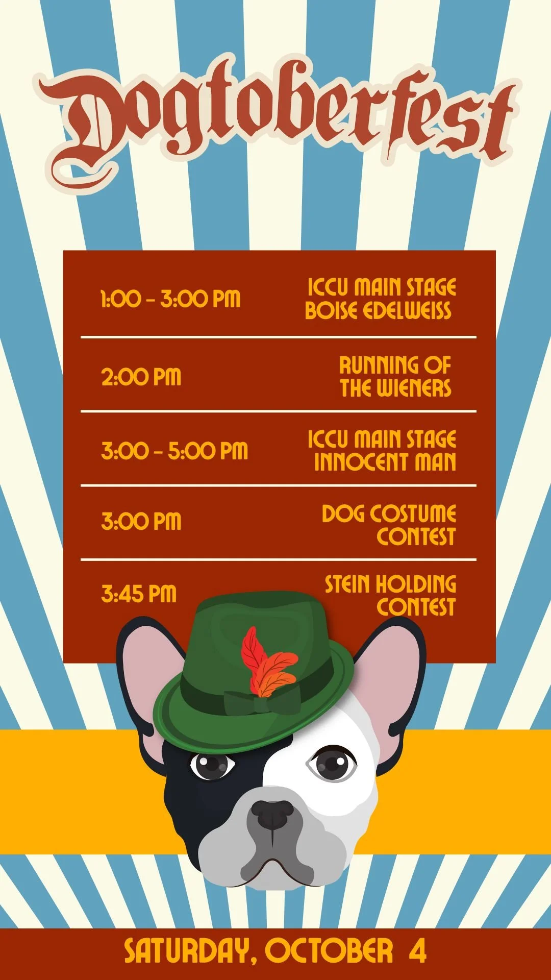Some event highlights include “Running of the Wieners,” so pack up those Dachshunds and bring them on down to the plaza. They’re just so fun to watch! Dress up your pup in their finest threads ‘cause there’s a costume contest. Go all out! Think you have the forearm strength of a 19th-century Bavarian farmer? Prove it! We’re having a Stein Holding Contest, so get those arms prepped and ready for the occasion.