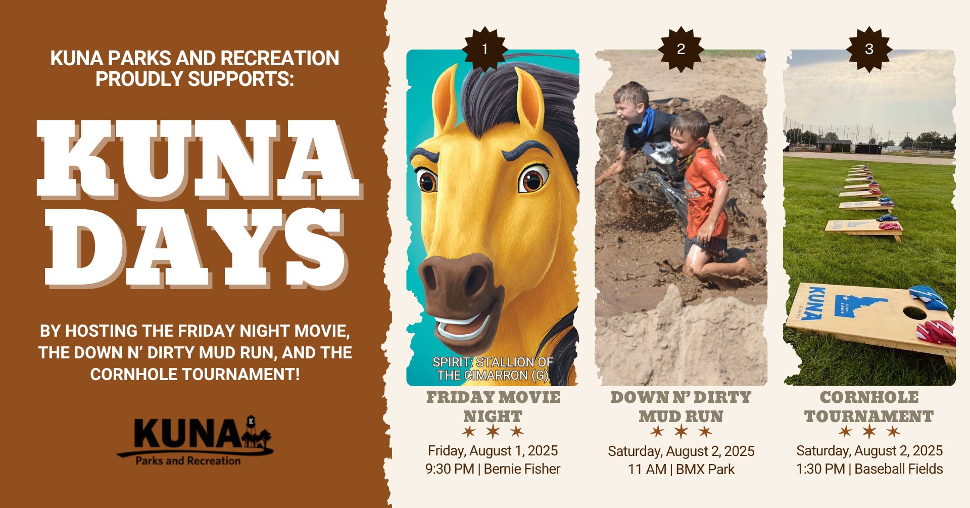The City of Kuna and our Parks and Recreation Department is proud to support Kuna Days by hosting the Friday Night Movie, The Down N’ Dirty Mud Run and The Cornhole Tournament every year.