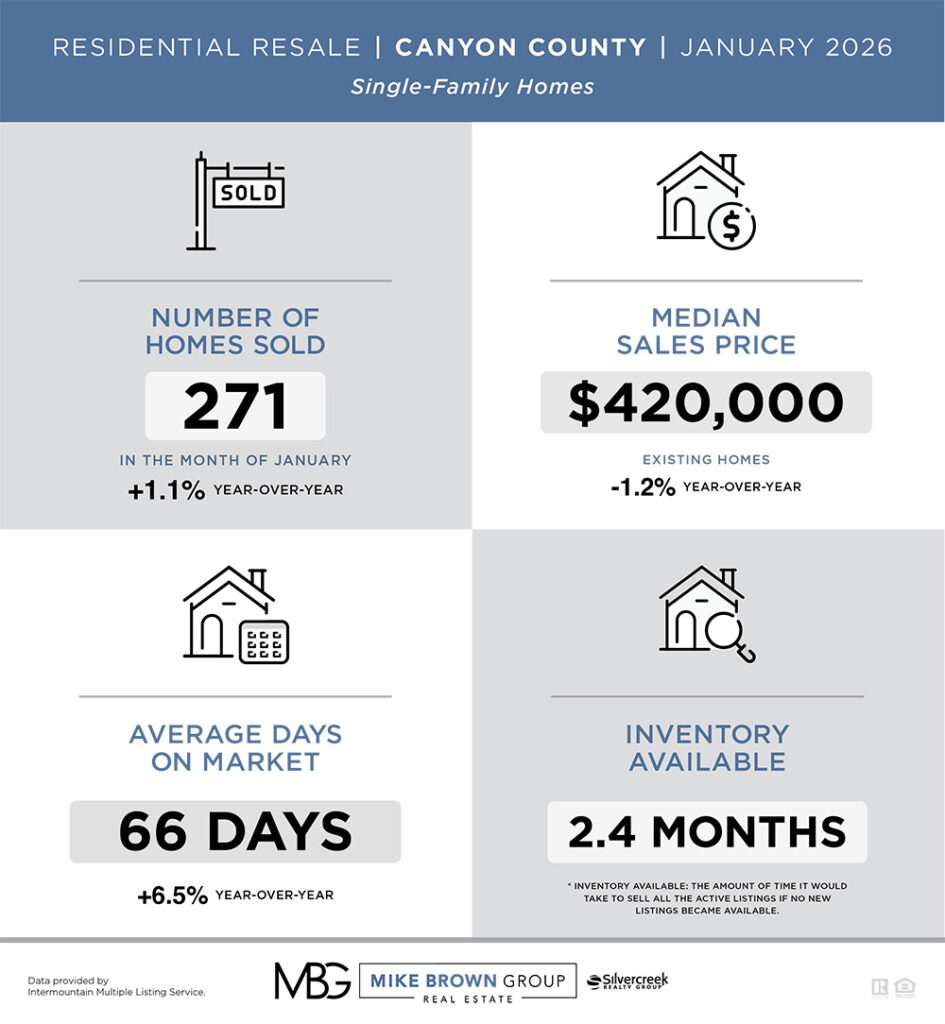 Stay informed about the latest trends in the Treasure Valley’s resale housing market. This January 2026 update highlights key activity in Ada and Canyon counties, including homes sold, median price, days on market, and available inventory.